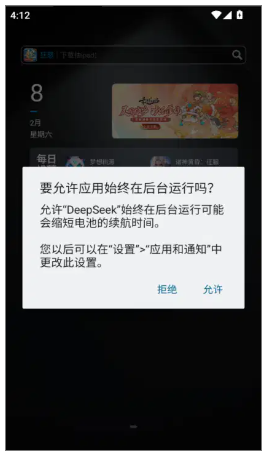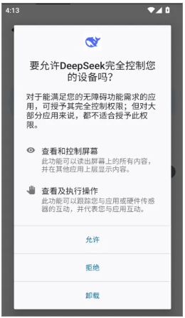用户一旦点击运行仿冒APP,该APP会提示用户“需要应用程序更新”,并诱导用户点击“更新”按钮。用户点击后,会提示安装所谓的“新版”DeepSeek应用程序,实际上是包含恶意代码的子安装包,并会诱导用户授予其后台运行和使用无障碍服务的权限,如图3至图6所示。