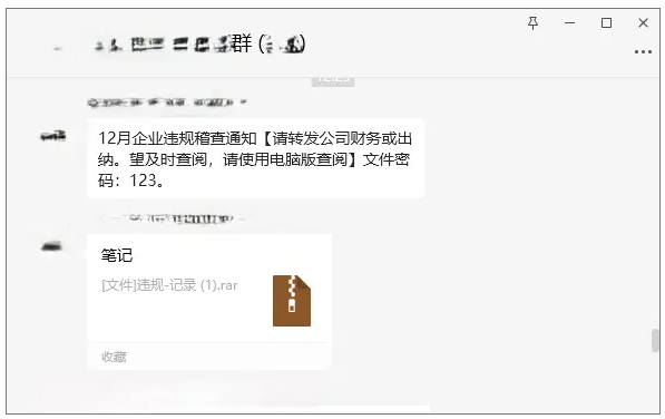 近日,国家计算机病毒应急处理中心和计算机病毒防治技术国家工程实验室依托国家计算机病毒协同分析平台(https://virus.cverc.org.cn)在我国境内再次捕获发现针对我国用户的“银狐”木马病毒的最新变种。在本次传播过程中,攻击者继续通过构造财务、税务违规稽查通知等主题的钓鱼信息和收藏链接,通过微信群直接传播包含该木马病毒的加密压缩包文件,如图1所示。