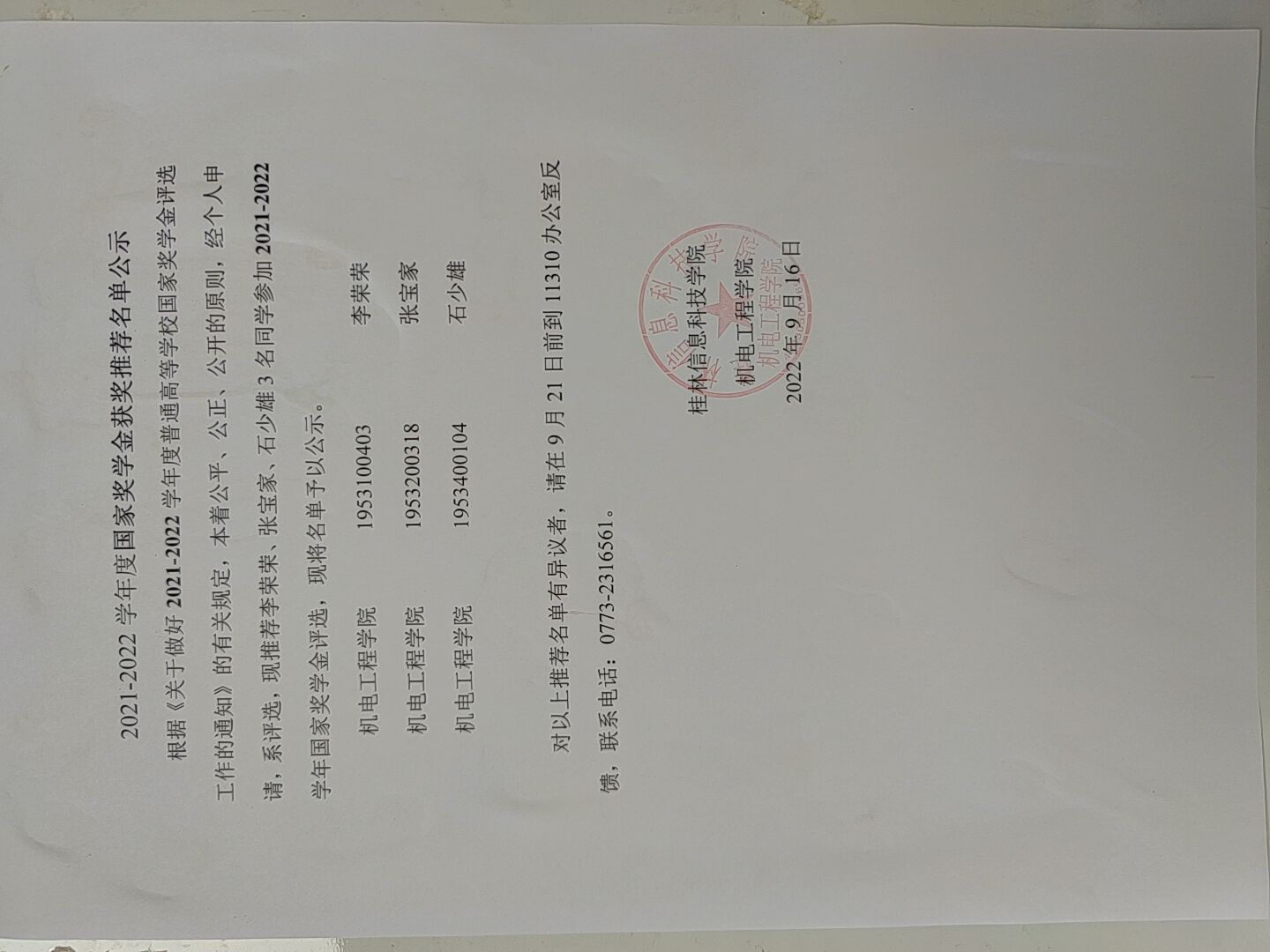 根据《关于做好2021-2022学年度普通高等学校国家奖学金评选工作的通知》的有关规定,本着公平、公正、公开的原则,经个人申请,系评选,现推荐李荣荣、张宝家、石少雄3名同学参加2021-2022学年国家奖学金评选,现将名单予以公示。