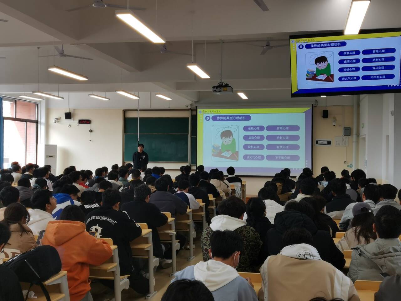 会上,辅导员由诚信的定义出发,分别从考试作弊的原因、考试作弊的后果以及作弊对心理健康的危害等三个方面进行讲解,并结合《学生手册》中的内容向大家强调诚信考试的重要性。最后,辅导员组织同学们阅读《诚信考试承诺书》并在上面签名。
