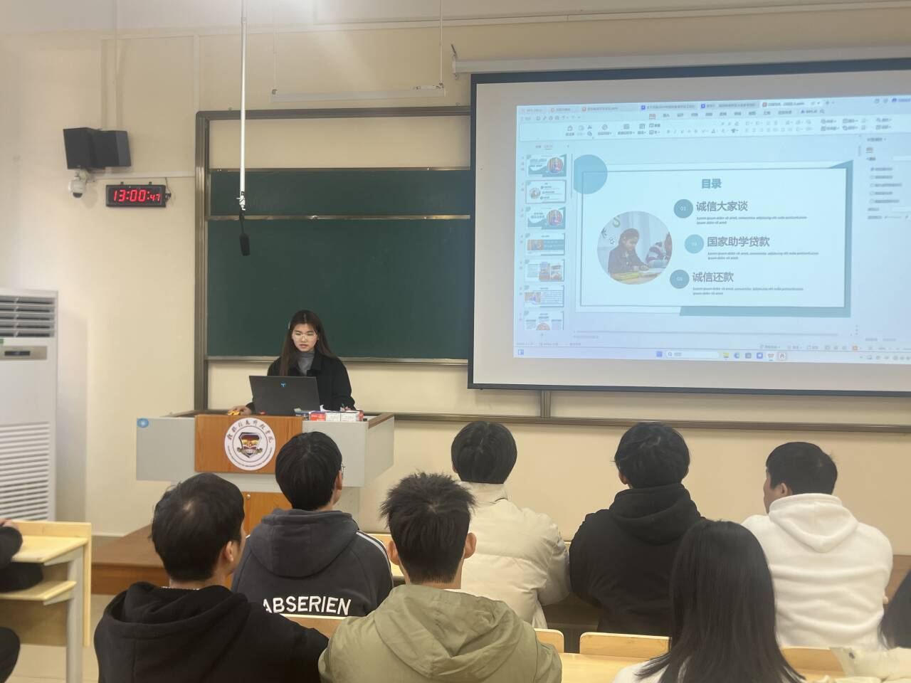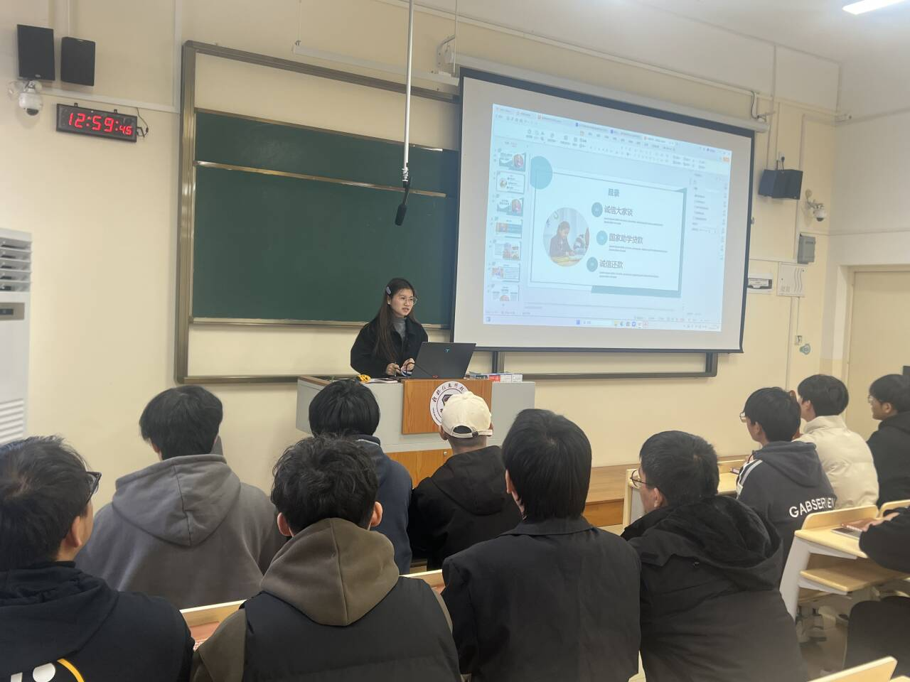 会上,主讲人区斌斌以诚信为切入点,引用名人名言,强调了诚信的含义以及诚信的重要性,同时详细讲解了国家助学贷款目的、含义及国家助学贷款违约后果,