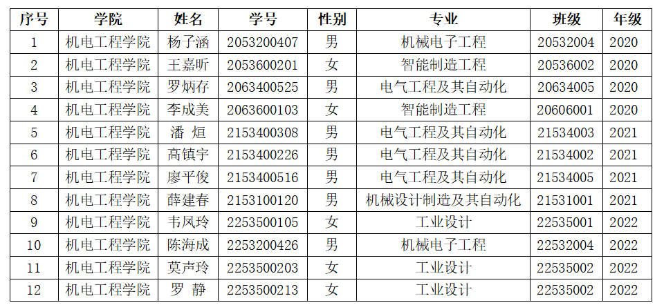 2022-2023学年机电工程学院筑梦奖学金名单公示