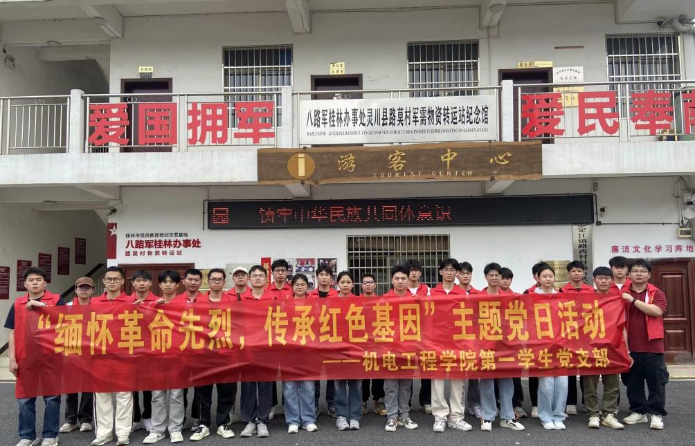为弘扬爱国主义精神,传承红色基因,4月26日下午,机电工程学院第一学生党支部赴八路军桂林办事处灵川县路莫村军需物资转运站开展“缅怀革命先烈,传承红色基因”主题党日活动。
