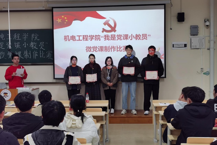 为深入学习贯彻习近平新时代中国特色社会主义思想,创新党员教育形式,1月2日,机电工程学院第一学生党支部在D210教室举办"我是党课小教员"微党课制作比赛。支部书记严继玲、支部学生党员及入党积极分子参与,会议由邓寿任同志主持。