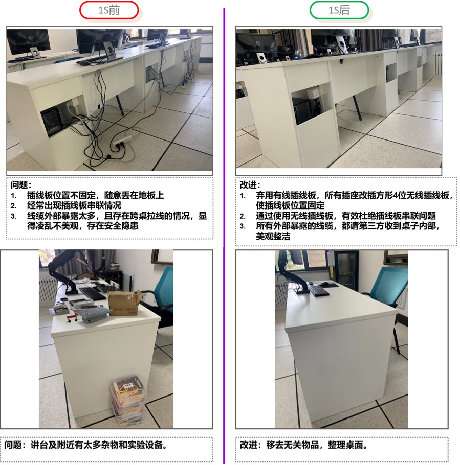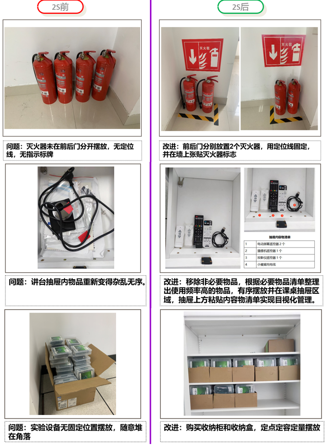 (1)清除垃圾或无用、可有可无的物品;全面检查,整理所有物品,包括实验桌(台)、设备、仪器 和玻璃器皿、储物柜、文件、工具、洁具等;