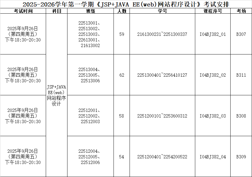 2025-2026学年第一学期《JSP+JAVA EE(web)网站程序设计》考试安排如下: