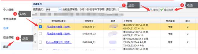 ①选课系统开放时,学生登录教务系统,点击选课,点击查询,课程列表会出现本学期所开设的可选课程列表,从中找到相应的课程序号,进行勾选后,再点提交选课。
