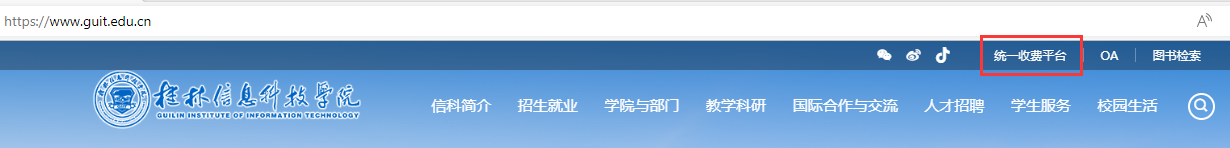 第一步:从学校官方主页(http:)右上角点击“统一收费平台”链接进入,进行缴费。