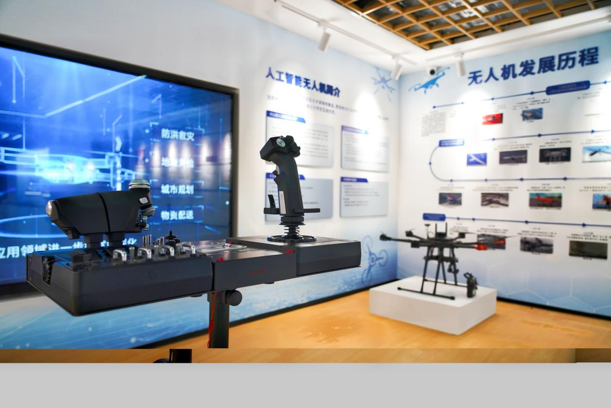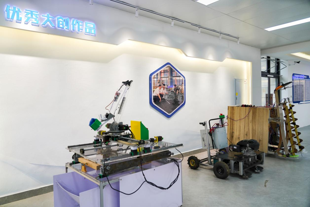 创新实践中心设有近500平方米的综合厅,集文化长廊、路演厅(约180㎡,可容纳90余人)、成果展示厅(含机甲、智能车、无人机、数字、机电、电子及大创七大展区)为一体。