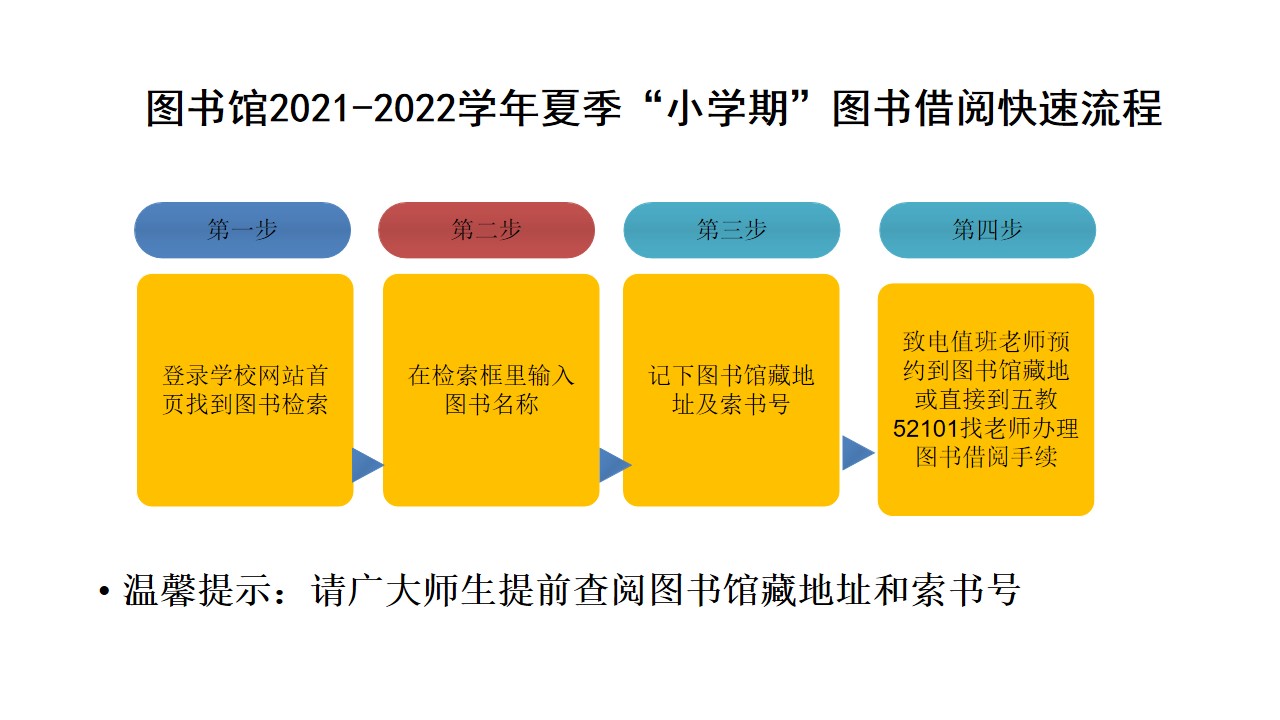 图书馆2021-2022学年夏季“小学期”图书借阅快速流程PPT可从附件下载。