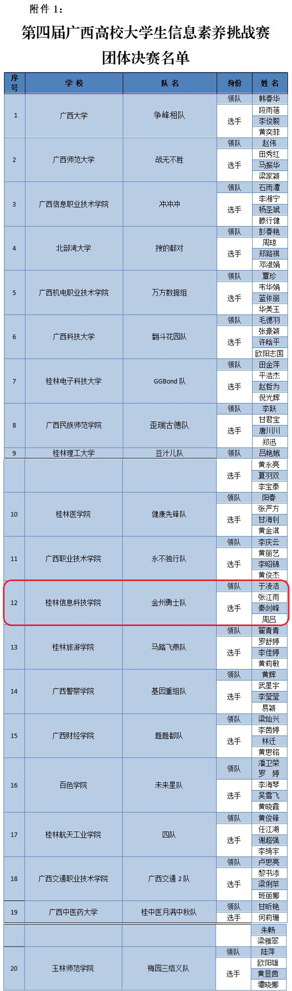 5月20日由图书馆组织参加的第四届广西高校大学生信息素养挑战赛团队赛顺利完成,beat365官网参赛团队“金州勇士队”成功入围团体赛决赛。决赛将于6月3日在桂林医学院临桂校区举行。