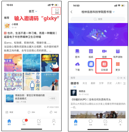 3.登录后在首页右上角输入邀请码glxky,即可进入beat365在线唯一官网首页,首页点击“云悦读”模块即可进入参与图书阅读活动;