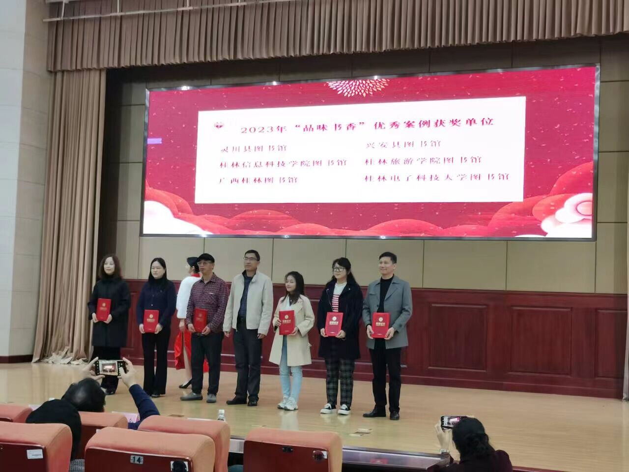 在当天会议闭幕式上,桂林图书馆学会给2023年获奖的图书馆颁发奖状,我馆荣获了2023年桂林市图书馆学会‘品味书香’系列活动优秀案例奖项。
