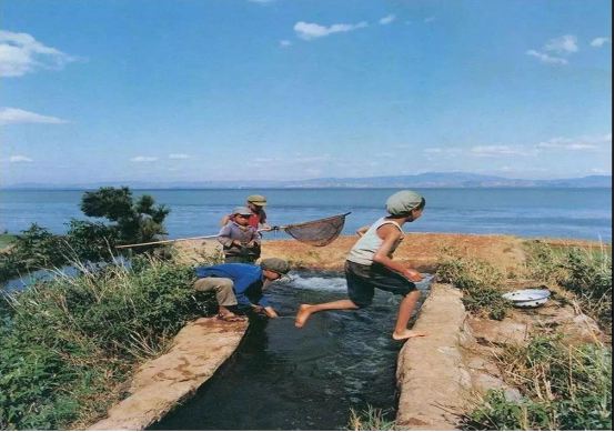 在他的镜头下,男孩子们很野、很尽兴。他们会拿着玩具枪打仗,在湖边光膀子打赤脚抓鱼,抱着比自己脸大的橘子汽水瓶,下雨了也要在木台上打乒乓球,放学路上勾肩搭背讲悄悄话……