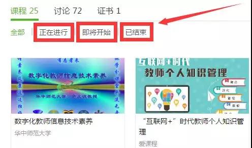 进入“个人中心”还有另一种选课方式呦!还可以按照开课进行程度分为“正在进行”、“即将开始”和“已结束”的课程。