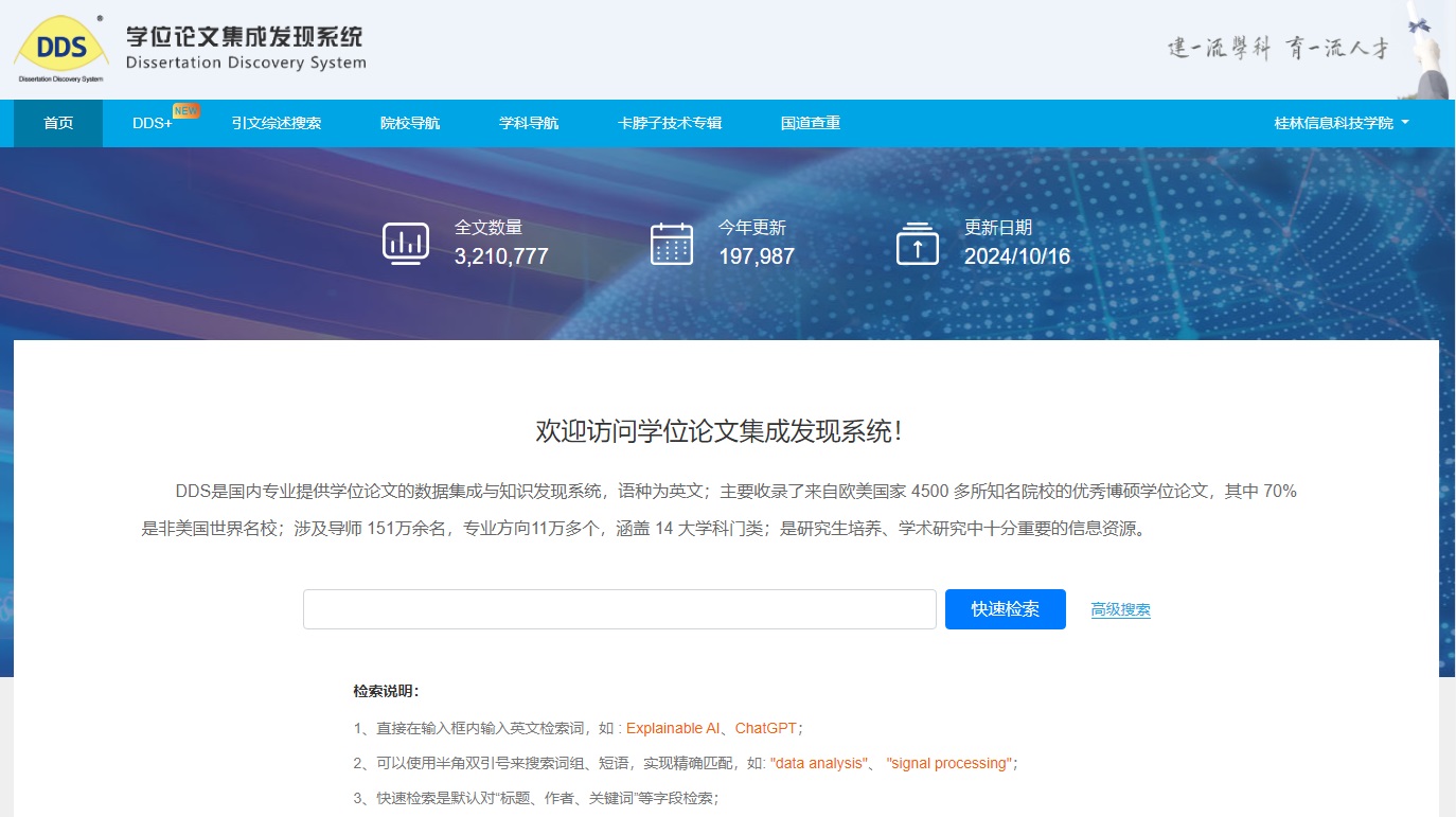DDS(Dissertation Discovery System),即学位论文集成发现系统,是专业提供学位论文的数据集成与知识发现系统,语种为英文。