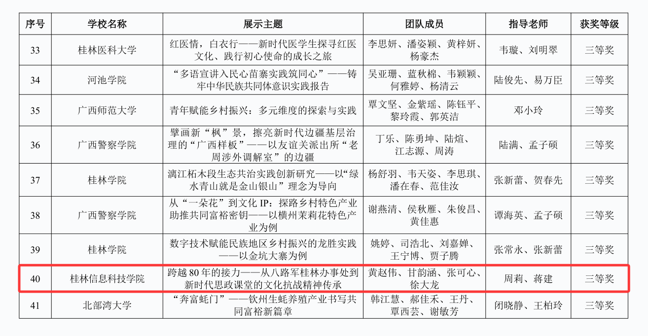 近日,自治区教育厅公布了2025年全区高校思想政治理论课研究性学习与实践性教学优秀成果评选活动获奖名单。beat365官网马克思主义学院周莉、蒋建老师指导的学生团队成果《跨越80年的接力——从八路军桂林办事处到新时代思政课堂的文化抗战精神传承》(团队学生成员:黄赵伟、甘韵涵、张可心、徐大龙)荣获三等奖。