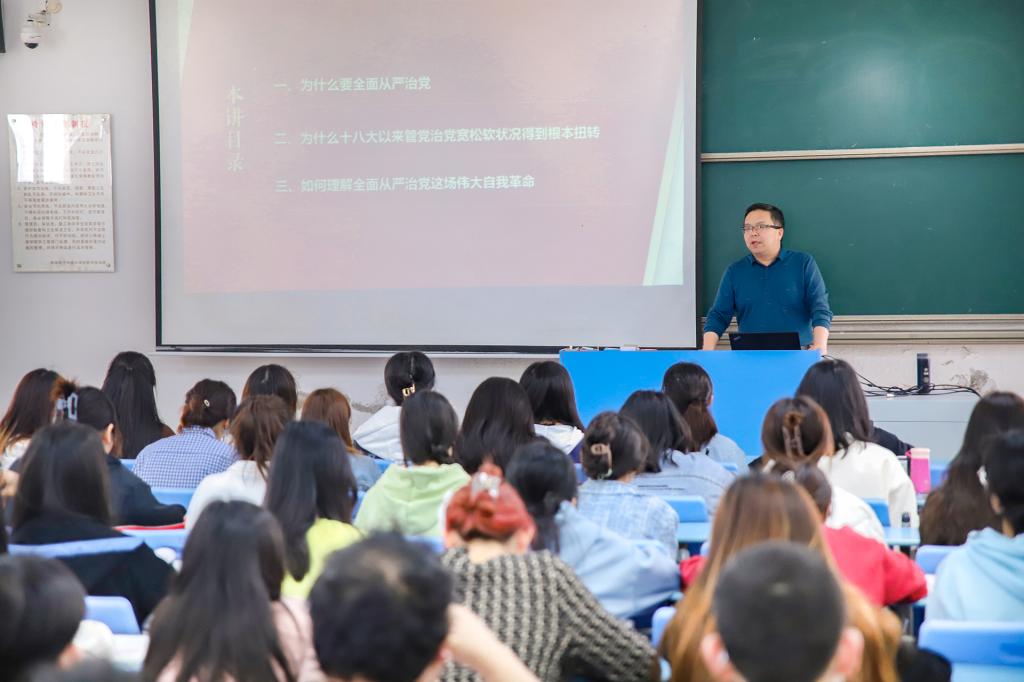 为贯彻党的二十大精神,全面落实立德树人主体责任,2023年4月6日,学校党委书记甘勇为2021级国际经济与贸易的同学们讲授了一堂以《全面从严治党》为主题的深刻生动的思政课。