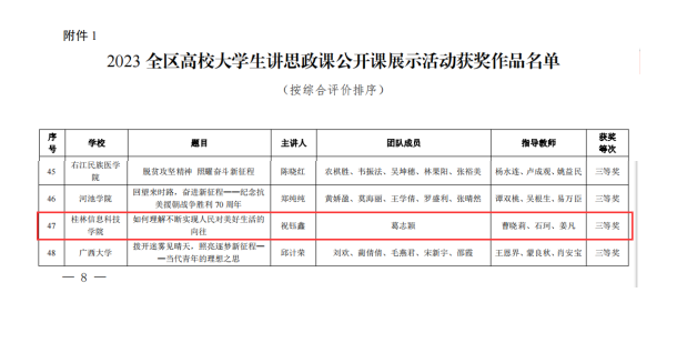 近日,由自治区教育厅主办的2023年习近平新时代中国特色社会主义思想大学习领航计划系列主题活动获奖名单公布。此次系列活动中,马克思主义学院共有3部作品获奖。在全区高校大学生讲思政课公开课展示活动中,曹晓莉、石珂、姜凡三位老师指导,学生祝钰鑫主讲的《如何理解不断实现人民对美好生活的向往》荣获本科组三等奖;在“我心中的思政课”全区高校大学生微电影展示活动中,周丽、杨海琼、何亚慧三位老师指导的《传承》和杨海琼、周丽、何亚慧指导的《温暖夕阳》均荣获本科组三等奖。