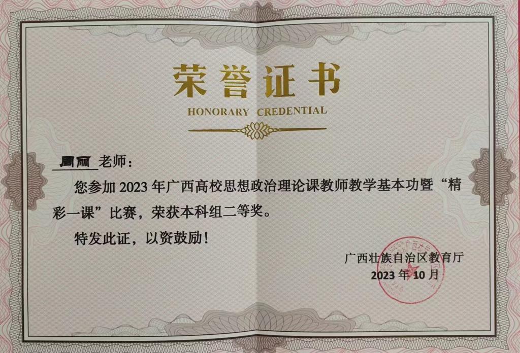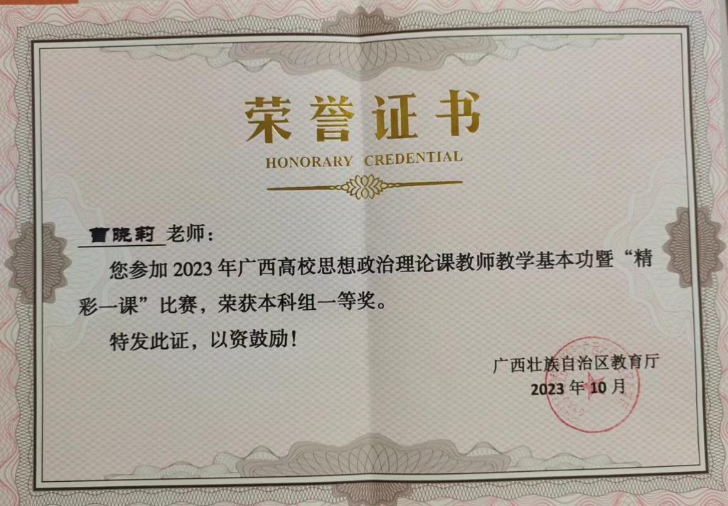 2023年10月14日,由自治区党委教育工委、自治区教育厅主办的2023年广西高校思想政治理论课教师教学基本功暨“精彩一课”比赛决赛落下帷幕,经过激烈的角逐,beat365官网马克思主义学院曹晓莉老师荣获一等奖,周丽老师荣获二等奖。