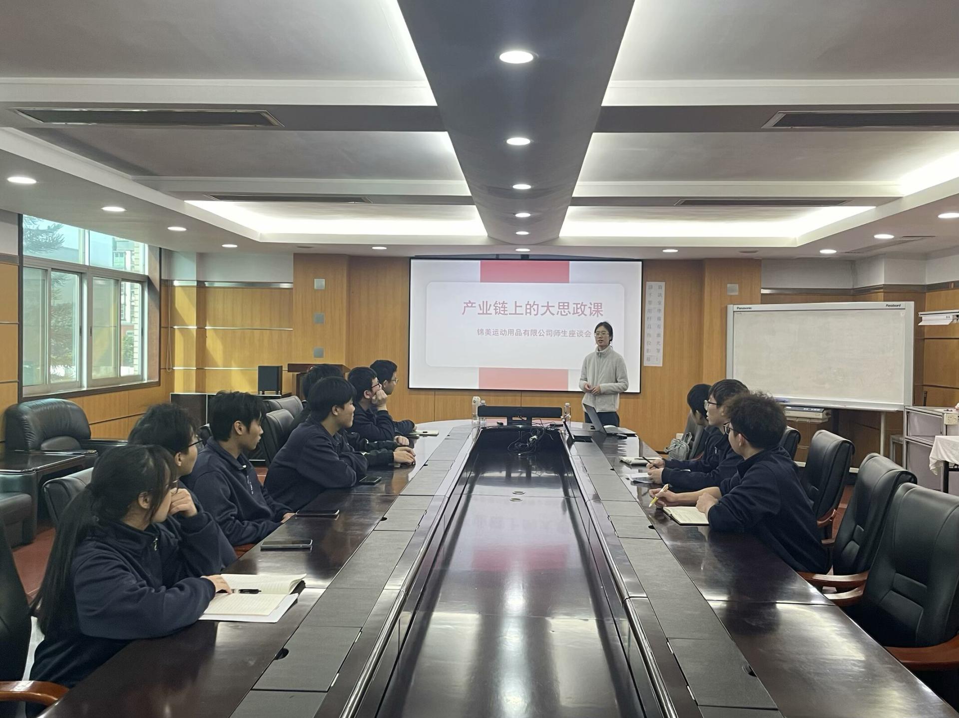 在三友联众集团股份有限公司和东莞锦美运动用品有限公司,学生代表首先介绍了公司概况,随后实地考察了生产车间和设备车间,同学们详细讲解了工作内容与标准。在师生座谈会上,王岩、肖碧清两位老师围绕实习困惑、理论实践转化及强国建设中的责任等议题深入交流,老师们将思政理论与产业实践案例融合,引导学生们理解“立德树人”、“工匠精神”及“实业报国”的意义,鼓励他们将个人优势转化为国家发展的动力。