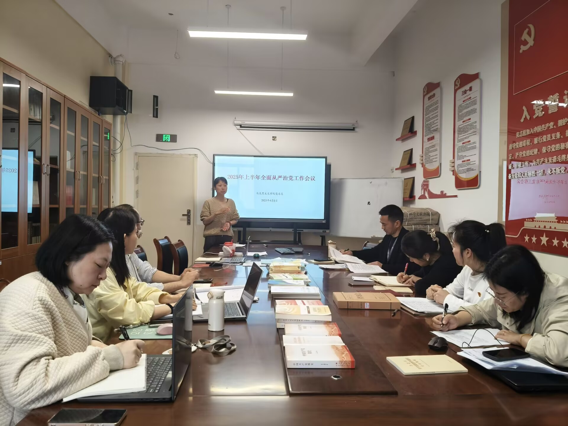 2025年4月8日,马克思主义学院党总支在E526会议室召开了2025年上半年全面从严治党工作会议。会议由党总支书记赵奕主持,全体党总支委员和党支部书记参会。