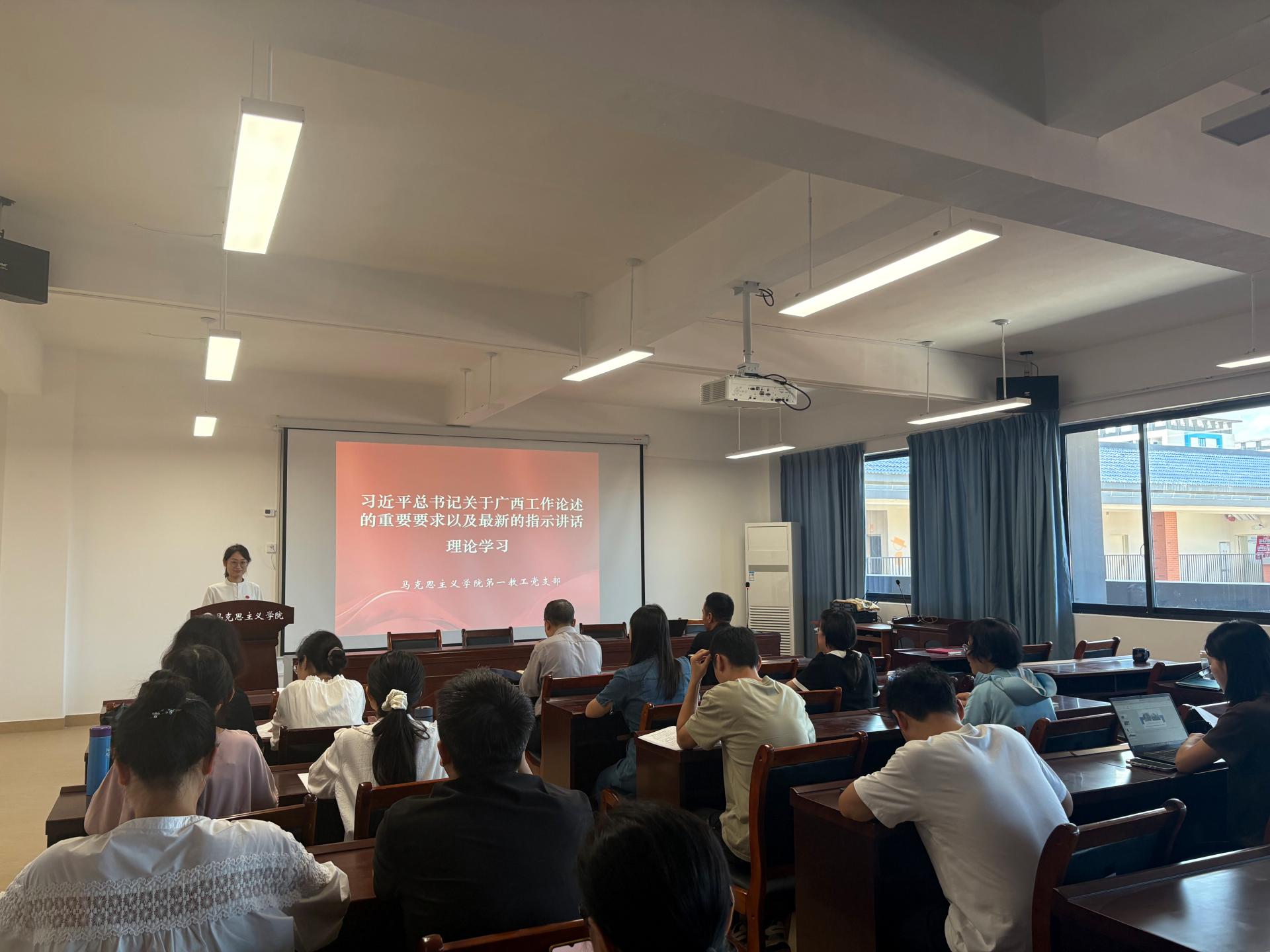 学习会上,党支部书记吴敏波首先带领全体党员从广西发展的战略定位、民族团结进步工作、生态文明建设、乡村振兴战略等方面重点学习了习近平总书记关于广西工作的重要要求和指示精神。大家一致认为,这些重要论述为广西发展提供了科学指引,也为高校思政教育工作指明了方向。教师们纷纷表示要将这些重要要求和指示精神融入教学科研和人才培养全过程,充分发挥思政课的育人功能,引导学生树立正确的世界观、人生观和价值观。