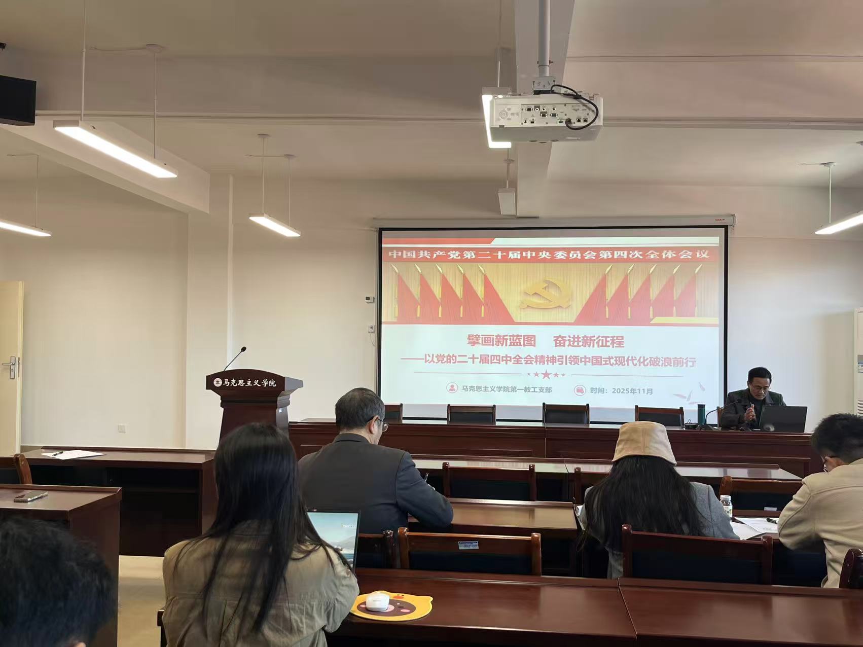 此次专题党课学习活动,不仅是一次深刻的理论武装,更是一次生动的实践动员。马克思主义学院教工第一党支部将始终秉持“支部建在教研室”的工作理念,通过系统学习党的二十届四中全会精神,进一步凝聚了思想共识,明确了前进方向。站在新的历史起点上,支部全体党员将切实把学习成果转化为铸魂育人的强大动力,以更高的政治站位、更强的使命担当,推动全会精神进教材、进课堂、进头脑,为培养担当民族复兴大任的时代新人作出新的更大贡献。