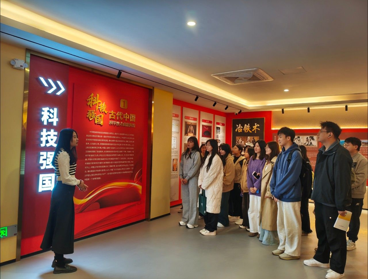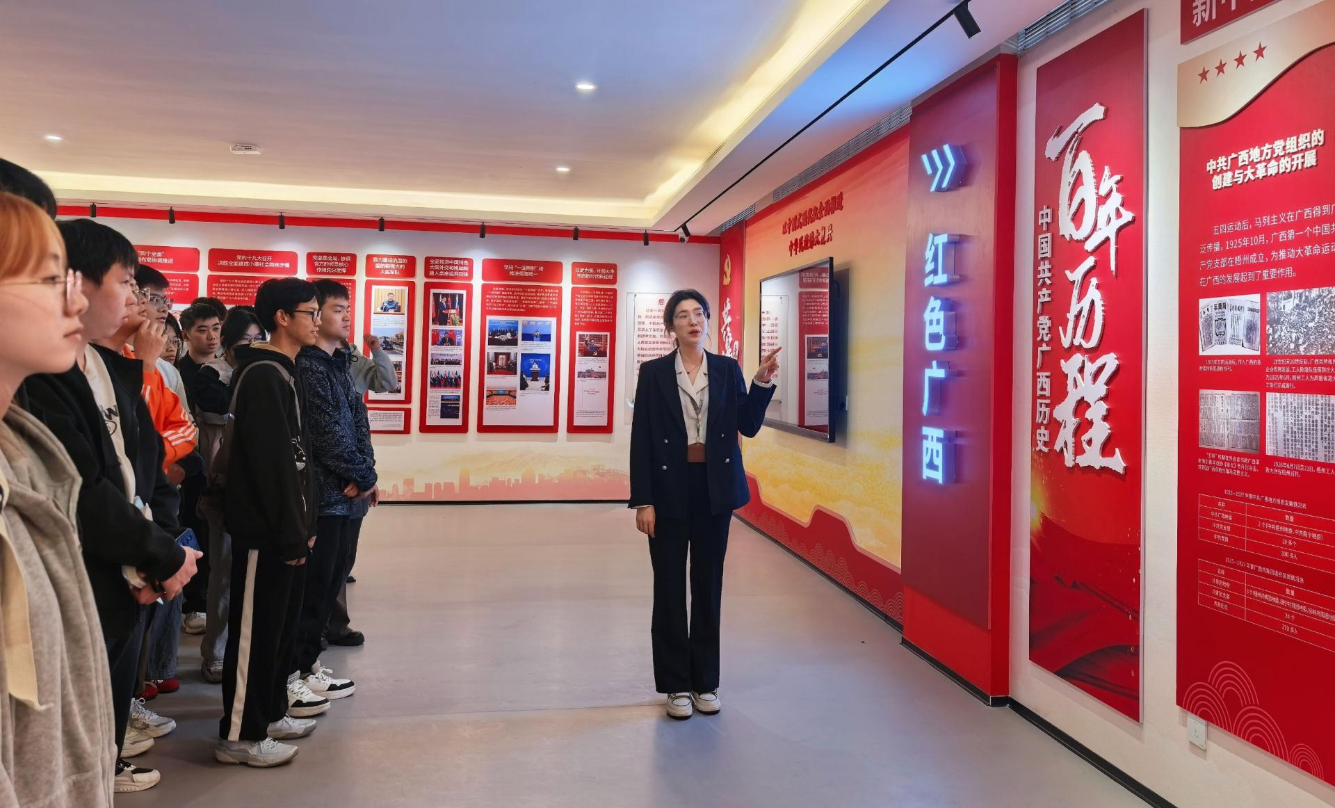 活动中,教师们紧扣《马克思主义基本原理》课程教学要点,充分挖掘思政馆“百年党史”“中国精神”“红色广西”“科技强国”等板块的育人资源,将其转化为鲜活的教学素材。在“百年党史”板块,借助丰富的史料,生动阐释“人民是历史的创造者”这一唯物史观核心原理;在“中国精神”板块,则通过梳理共产党人的精神谱系,帮助学生理解先进社会意识对社会发展的能动作用;在“红色广西”板块,教师们结合八桂大地的革命与建设历程,使理想信念教育更加具象化;而在“科技强国”板块内,通过展示国家重大科技成就,有力论证了“科学技术是第一生产力”的时代内涵。同学们全程积极参与,在沉浸式体验中深化理论认知,通过现场提问、互动交流等方式,展现出浓厚的学习热情和理论思考深度。