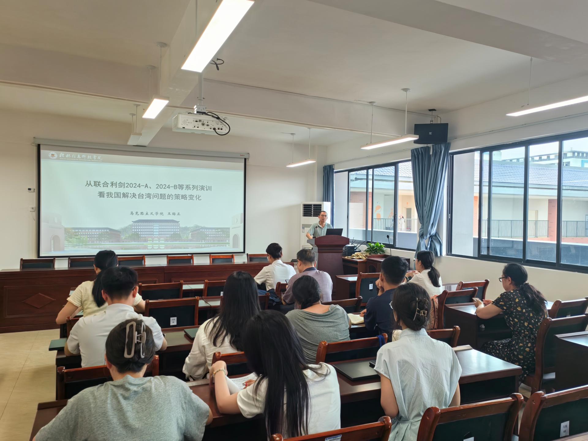 2025年6月27日上午,马克思主义学院的“教授大讲堂”系列讲座在G610会议室顺利举办。本次讲座特邀学院的王贻正副教授担任主讲,他以“深度解读联合利剑军演聚焦对台策略新变化”为题,为全体教职工带来了一场深入剖析台海局势的专题讲座。
