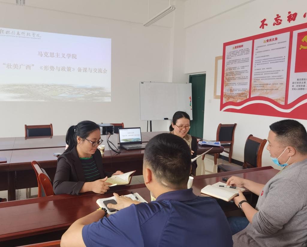 为上好“形势与政策”课,贯彻执行《教育部办公厅关于印发<高校“形势与政策”课教学要点(2022年上辑)>的通知》与《自治区教育厅办公室关于印发<广西高校大学生区情教学热点>(2022年)的通知》文件要求,马克思主义学院开展“形势与政策”备课与交流会。