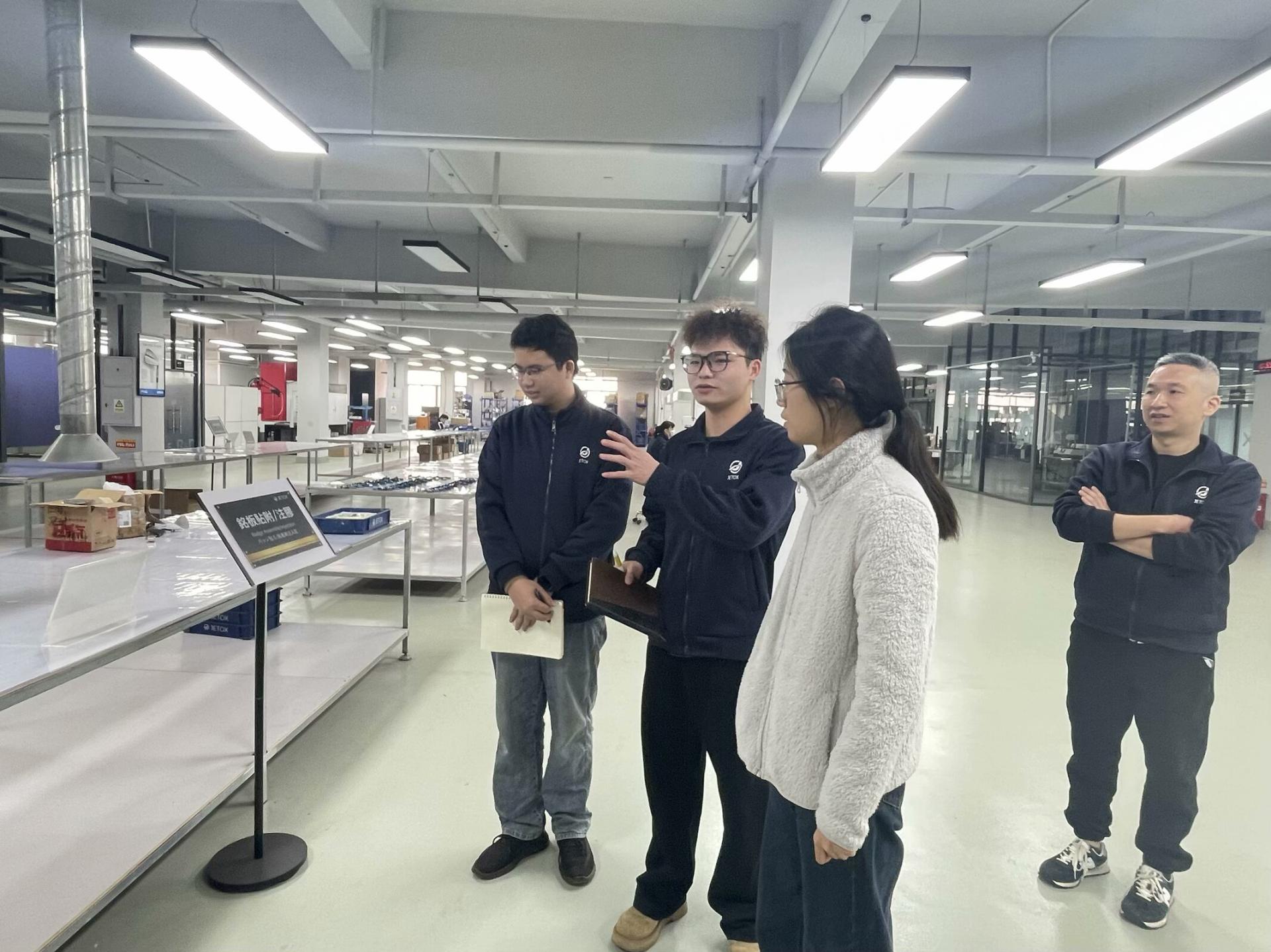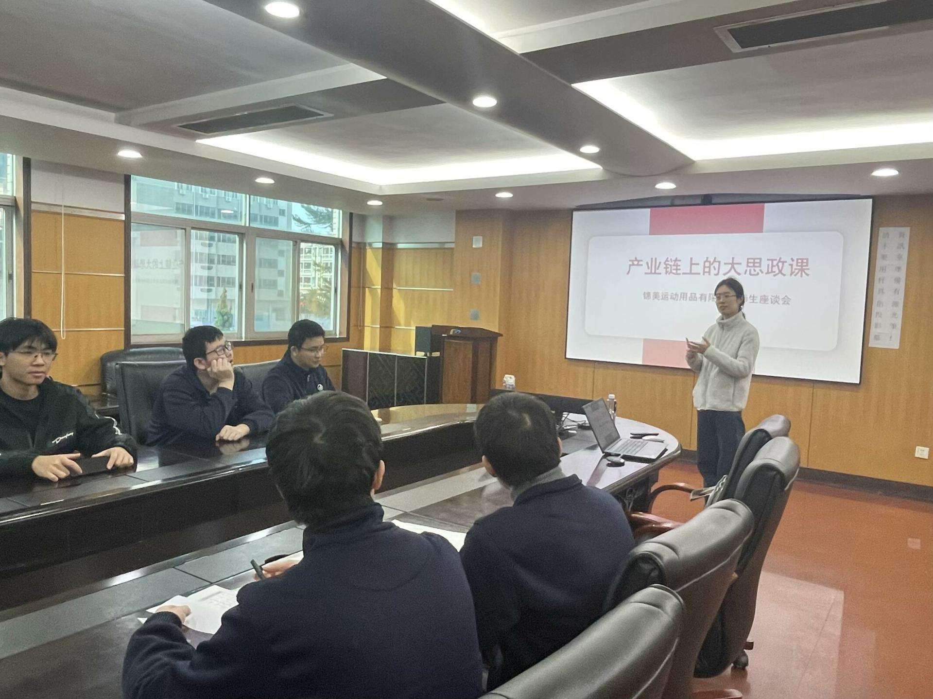 在三友联众集团股份有限公司和东莞锦美运动用品有限公司,学生代表首先介绍了公司概况,随后实地考察了生产车间和设备车间,同学们详细讲解了工作内容与标准。接着,师生座谈会上,围绕实习困惑、理论实践转化及强国建设中的责任等议题深入交流,老师们将思政理论与产业实践案例融合,引导学生们理解“立德树人”、“工匠精神”及“实业报国”的意义,鼓励他们将个人优势转化为国家发展的动力。