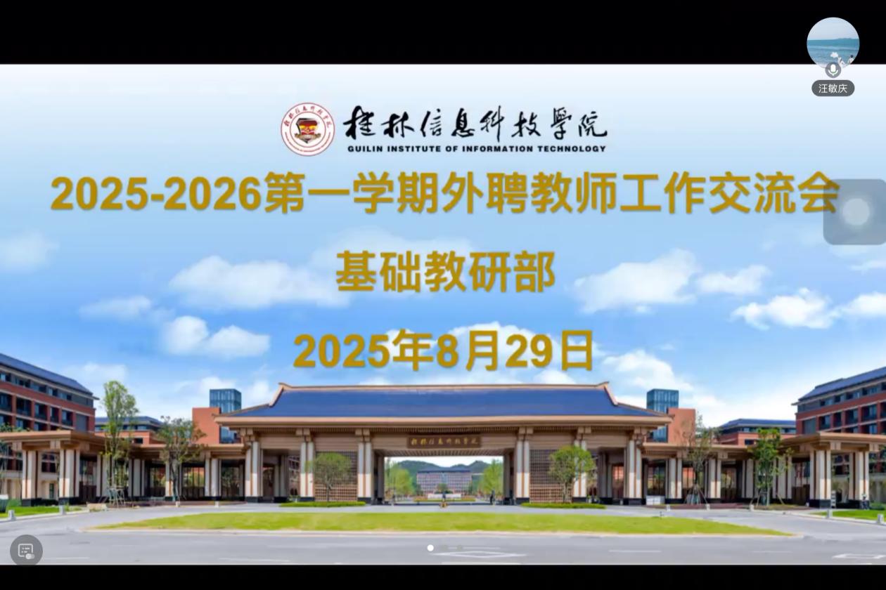 为进一步规范教学管理,加强外聘教师队伍建设,确保新学期各项教学工作有序开展,基础教研部于8月29日召开2025年秋季学期外聘教师工作线上交流会。本次会议由基础教研部主任助理汪敏庆主持,教研室主任及全体外聘教师参加。