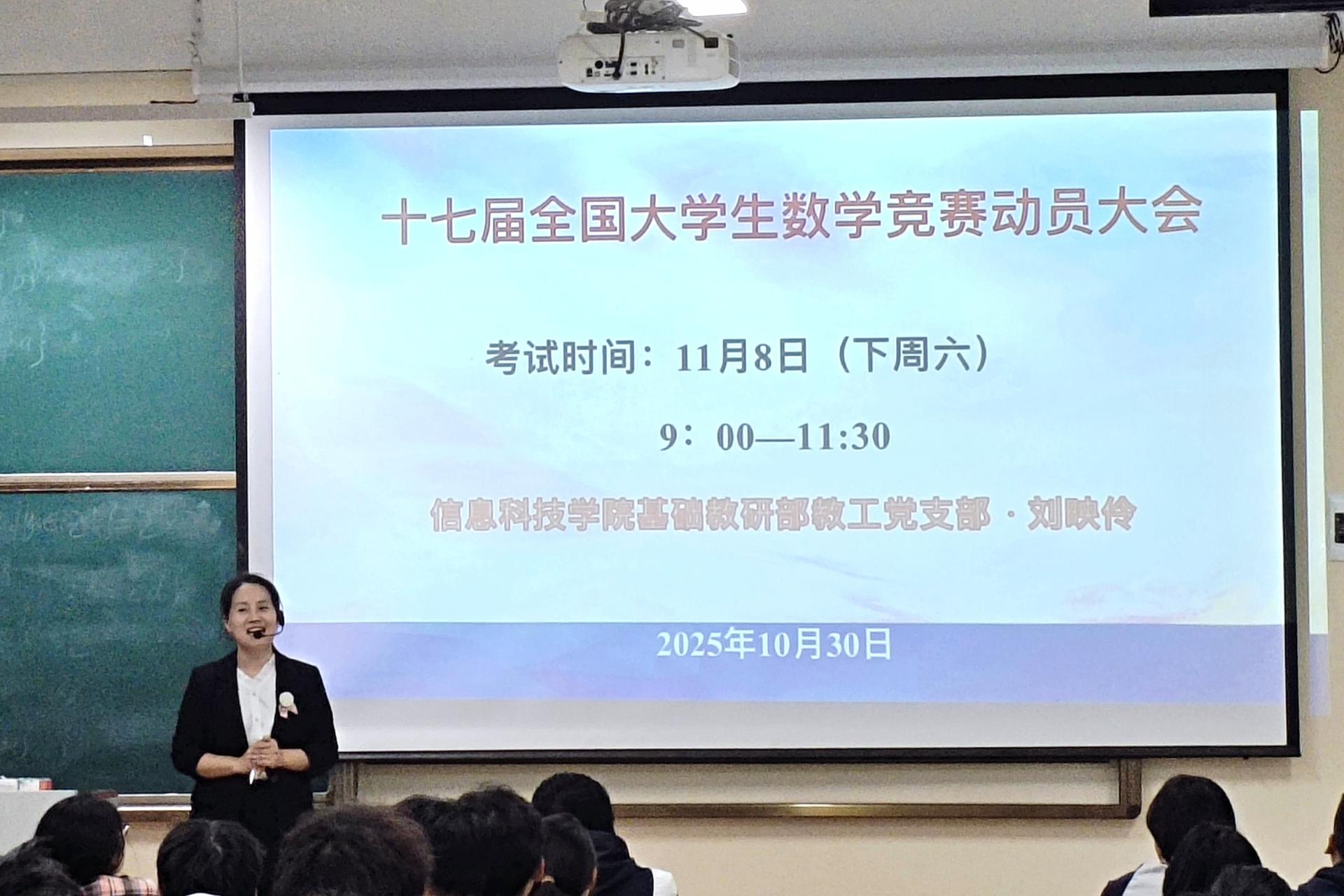 10月30日下午,基础教研部教工党支部书记刘映伶在C305为近120名备战第十七届全国大学生数学竞赛的学生代表作动员。她围绕赛制、指导团队、历年成绩、赛题分析和备考建议五方面进行讲解,鼓励学生:“这是个亲民又易获奖的比赛,认真准备就有收获,还能为考研加分”。