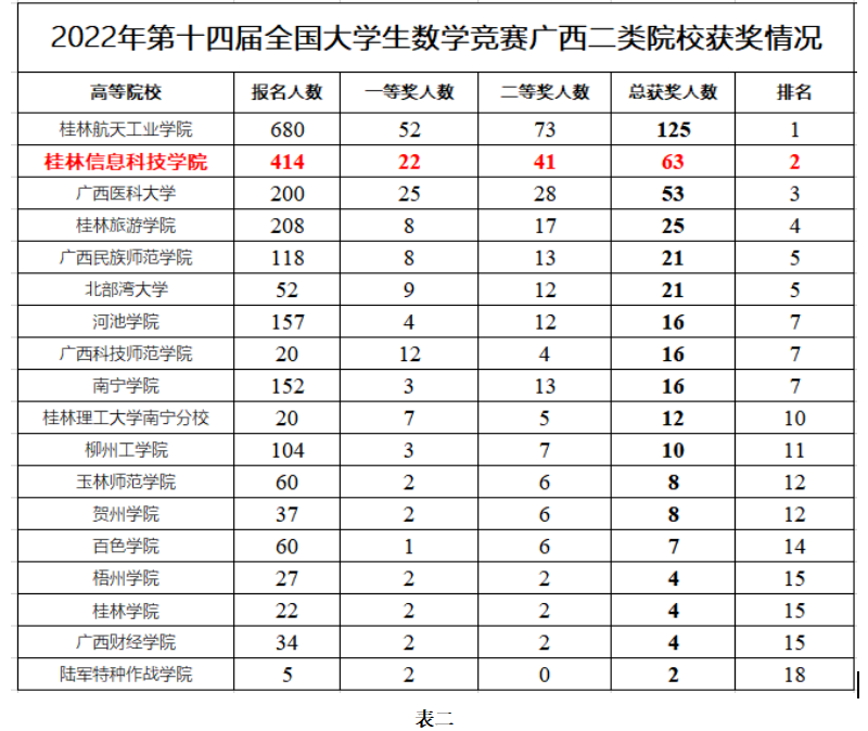 2022年11月12日,第十四届全国大学生数学竞赛初赛在各赛区进行,此次竞赛beat365官网共有414人报名参加,获奖人数共125人,其中区一等奖 22人,区二等奖 41人,区三等奖 62人。在参赛的18个广西二类院校中,beat365官网综合排名稳居第二,排名情况见表二。
