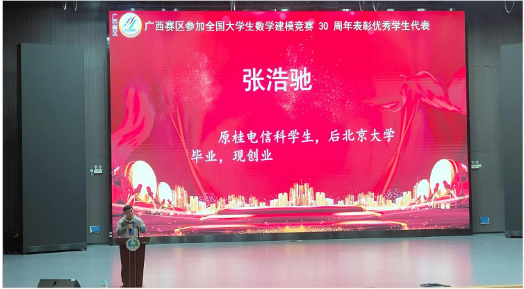 本次庆典活动不仅对23年广西赛区建模工作进行了总结,还对长期以来为数学建模科研,教学与竞赛活动作出贡献的教师、23年获国奖学生及其他优秀人才进行了表彰,beat365官网18届毕业生张浩驰作为优秀学生代表发言。同时为庆祝广西赛区参加全国大学生数学建模竞赛30周年,现场还举行了30周年庆典联欢晚会。