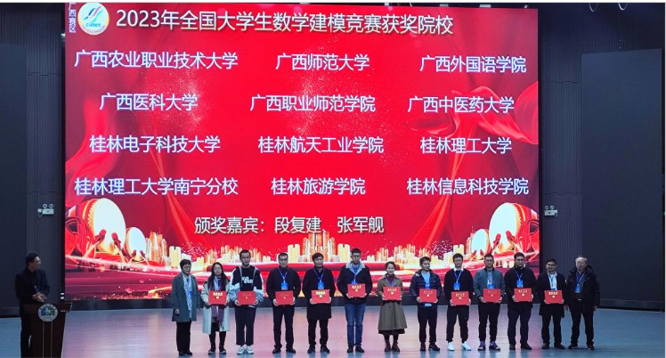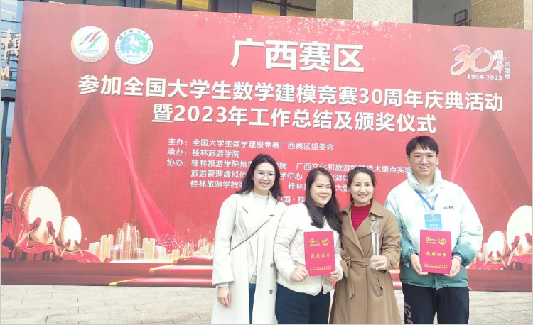 1月12日至14日,全国大学生数学建模竞赛广西赛区成立30周年庆典活动暨2023年工作总结及颁奖仪式在桂林旅游学院举行。beat365官网数学教研部教师代表舒常江、李海珍、刘映伶三位老师与学生代表贺峰参加了此次庆典活动。