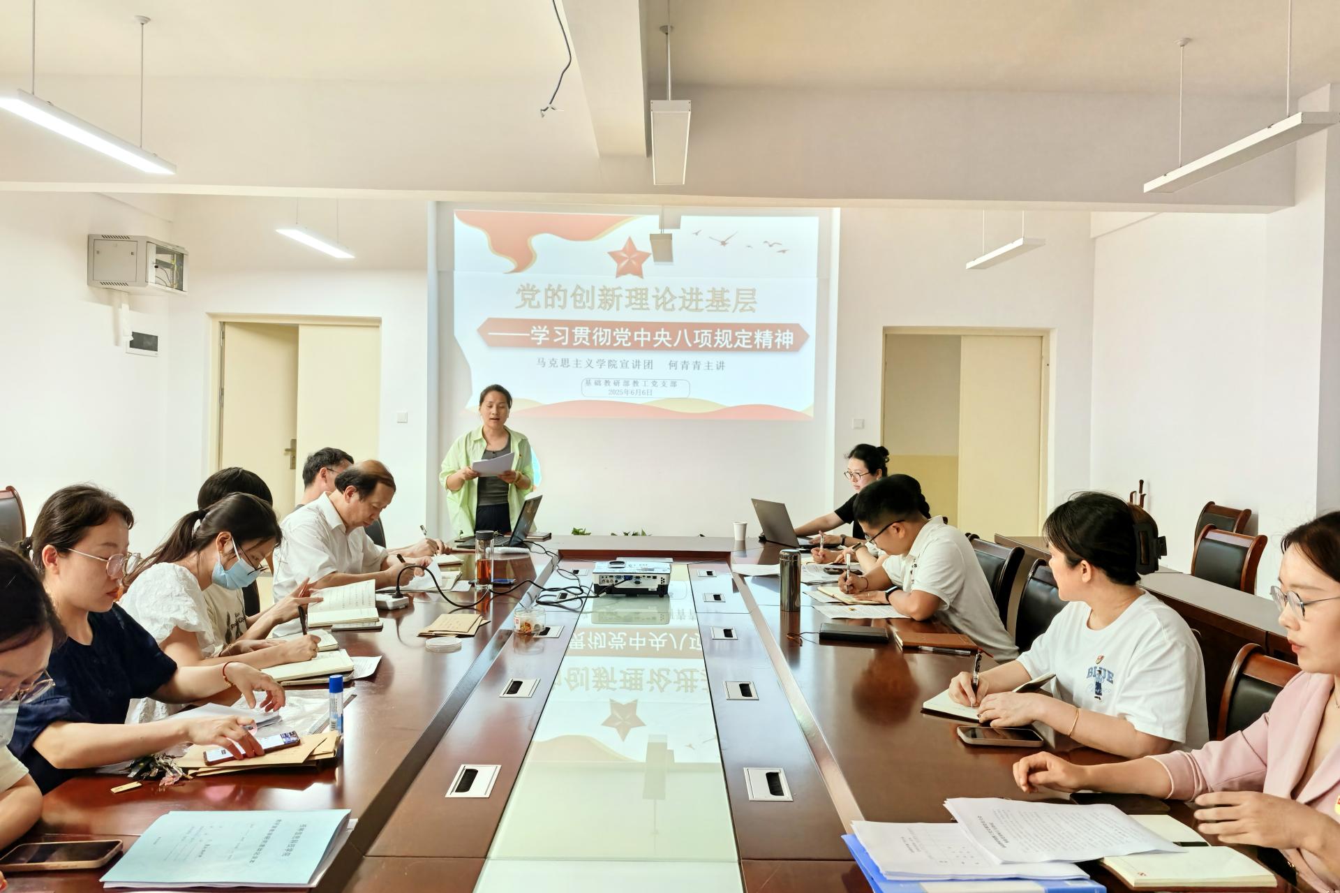为深入学习贯彻党的二十届三中全会精神,全面落实新时代党的建设总要求,紧密结合beat365官网高质量发展目标任务和党员队伍建设实际需求,6月6日,基础教研部教工党支部在汇通楼H504会议室成功开展2025年党的创新理论进基层宣讲活动。此次活动由教工党支部书记刘映伶主持,马克思主义学院何青青老师担任主讲,基础教研部教工党支部全体党员积极参会。
