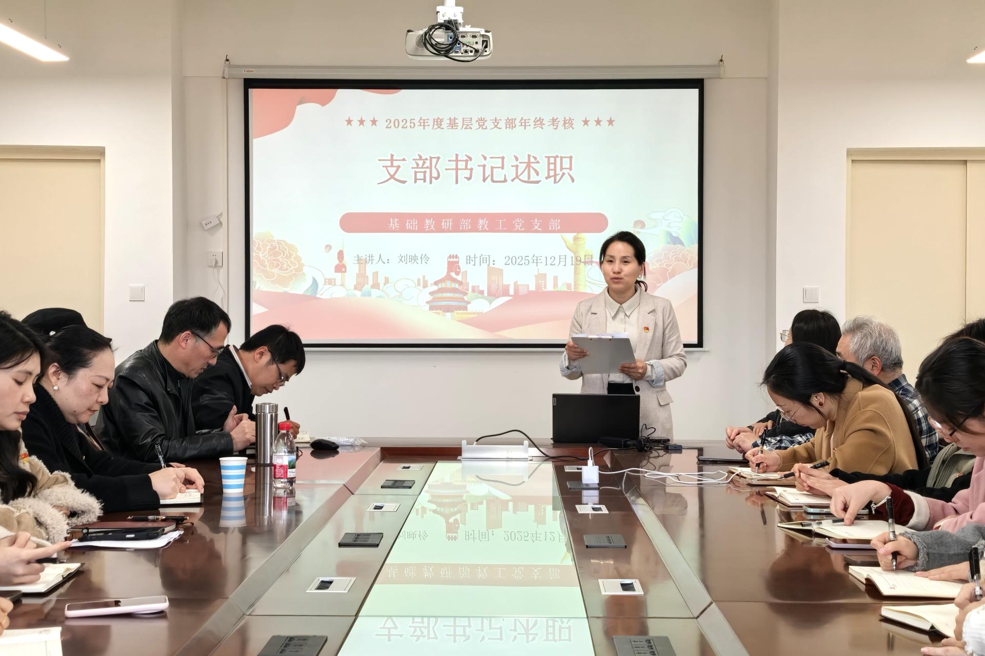 12月19日,基础教研部教工党支部在汇通楼H504会议室召开2025年度党支部书记工作述职会议。党总支委派总支委员剌啸媛同志到会指导监督,支部全体党员参加会议。