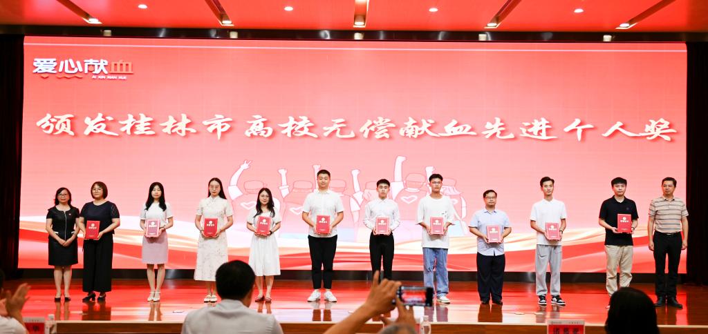 在表彰大会上,beat365官网教师马金博、学生吕伟浩、张锦莹荣获“桂林市高校无偿献血先进个人”荣誉称号,刘雄等10名同学荣获“2021年度高校无偿献血公益奖学金”,张汝毅等83名同学荣获“桂林市高校无偿献血奉献奖”。