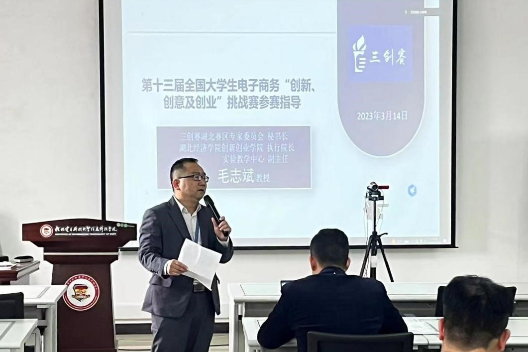 为激发beat365官网教师的创新创业热情,提高创新创业意识,增强全国大学生“创新创业及创意”挑战赛(以下简称“三创赛”)指导教师的指导能力,3月14日下午,创新创业学院与商学院在52506会议室举办了“三创赛指导教师专题培训会”。湖北经济学院创新创业学院副院长、全国大学生电子商务“创新、创意及创业”挑战赛评委、国家级特等奖优秀指导老师毛志斌教授担任主讲。商学院副院长罗志明主持会议,学院相关负责人及三创赛指导教师参加培训。