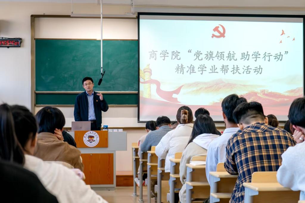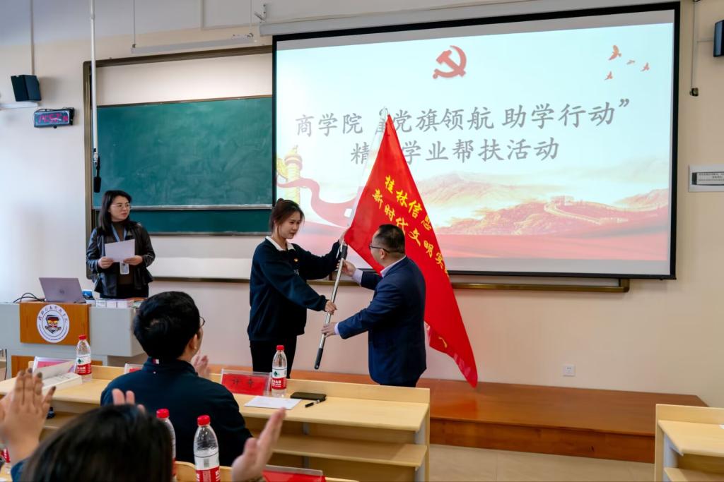 为进一步推进学习贯彻习近平新时代中国特色社会主义思想主题教育走深走实,以党建引领高质量学风建设,服务学校人才培养中心工作,11月28日,商学院在敏思楼D211开展“党旗领航助学行动”精准学业帮扶活动暨新时代文明实践志愿服务队授旗仪式。学院党政领导出席活动,学生党支部书记、全体辅导员、学生党员和结对帮扶学生参加活动。