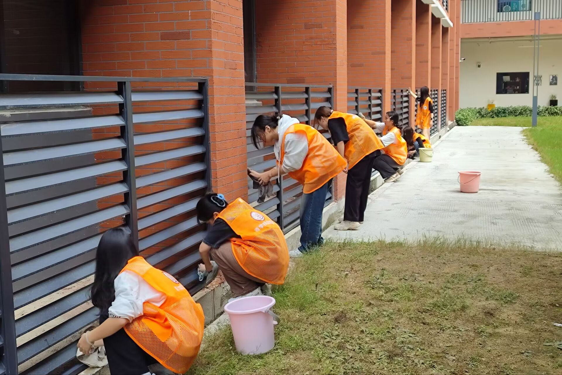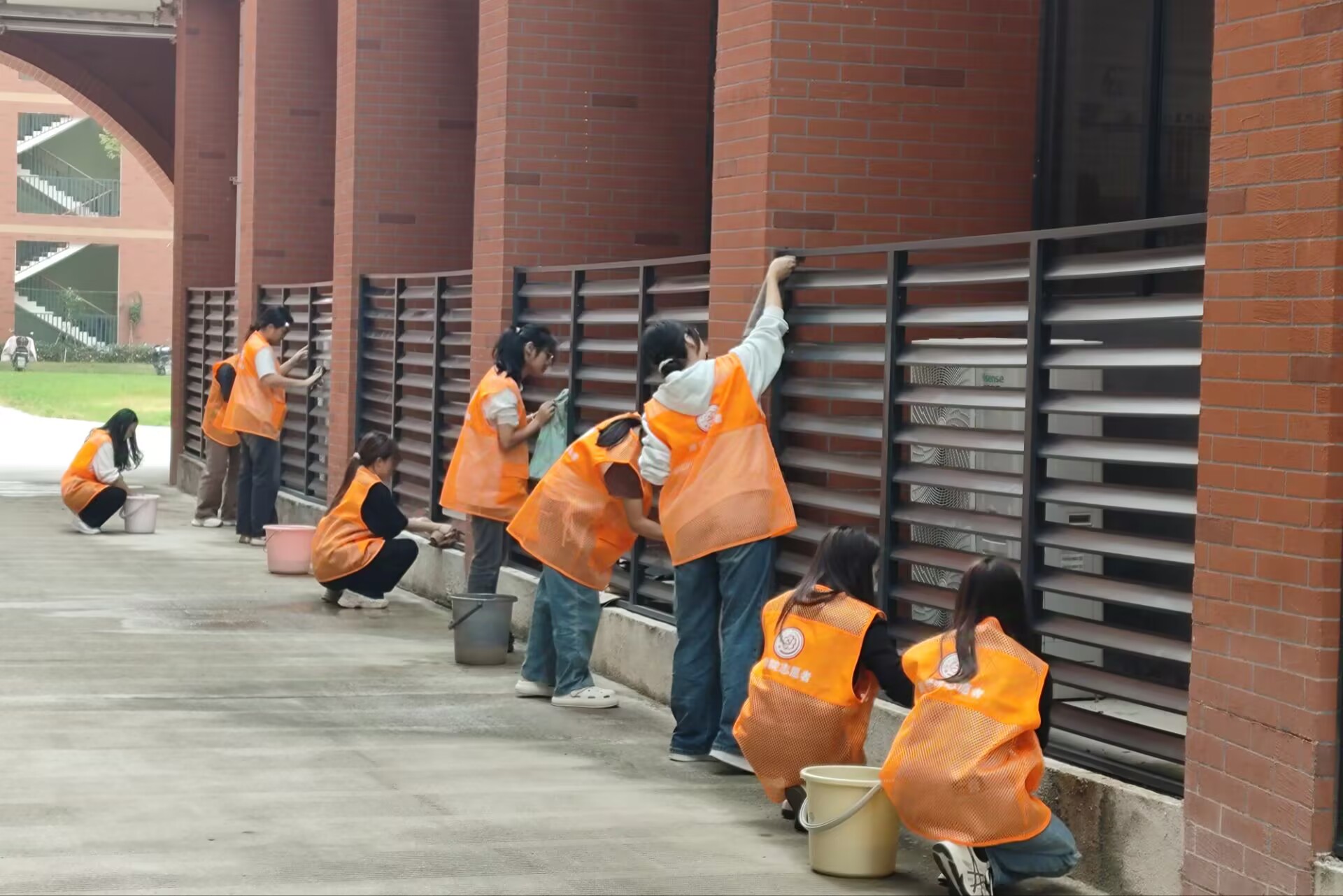 活动开始前,一群身着统一志愿者服装的入党积极分子,手持抹布、水桶和清洁工具,精神抖擞地集合在教学楼前。在学院党委组织员张洁老师的带领下,大家满怀热情,分组行动,迅速投入到紧张而有序的清洁工作中。他们有的细心擦拭着每一根扶手,确保不留死角;有的则小心翼翼地清洗窗户,让阳光更加畅通无阻地照进教室。经过一个中午的努力,教学楼内的扶手焕然一新,窗户明亮如镜,整个教学楼呈现出更加温馨、舒适的学习环境。