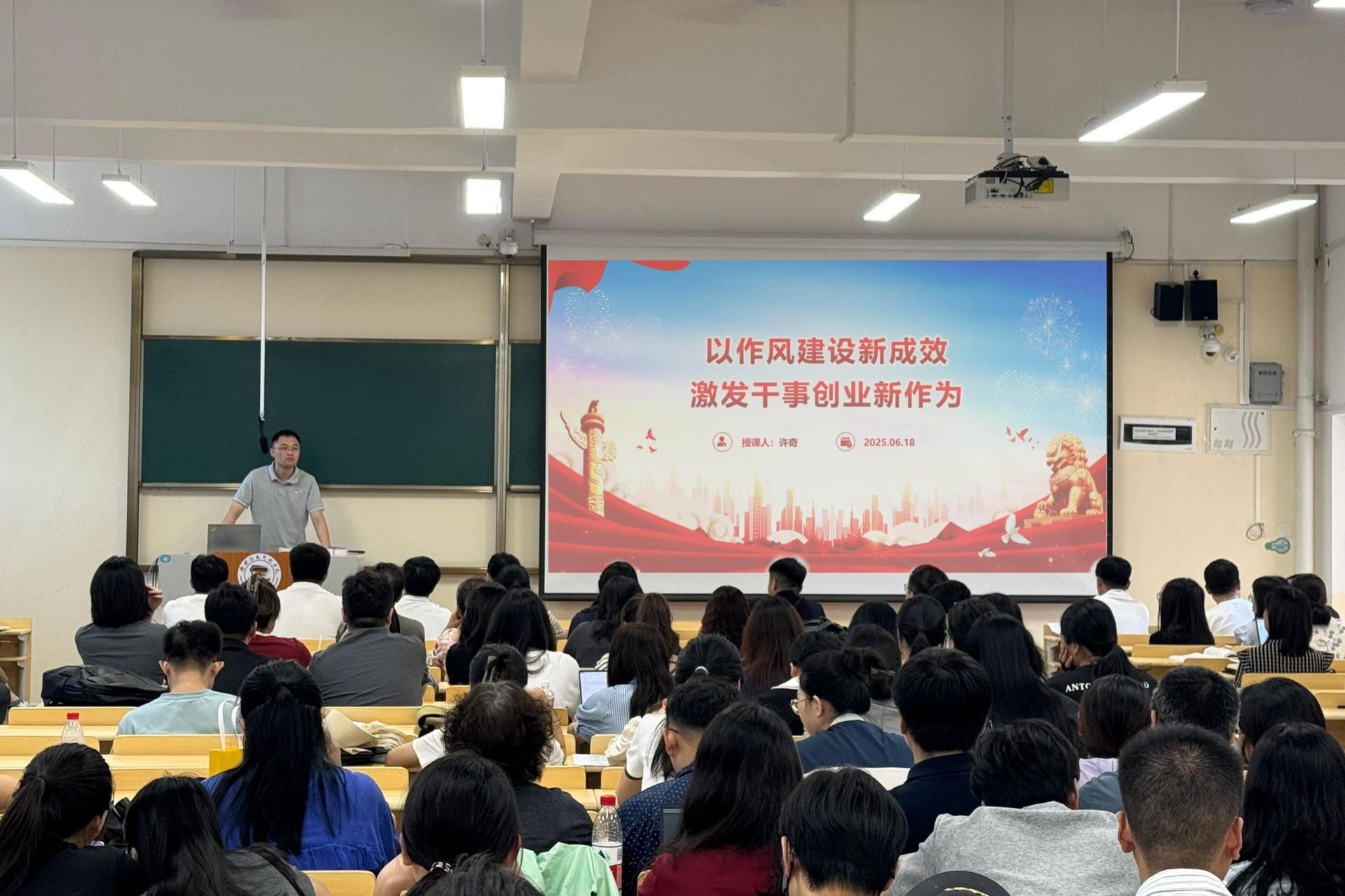 许奇书记从“背景意义、重要内容、实践方法”三个维度对作风建设展开全面且深入的讲解。强调党的作风犹如党的形象名片,直接关乎人心向背以及党的生死存亡,作风问题本质上就是党性问题。要求全体党员要以良好作风和形象为基础,将中央八项规定的要求转化为真抓实干的行动,持之以恒纠治“四风”。领导干部要充分发挥“头雁效应”,以身作则、以上率下,带动全体党员作风的根本转变。围绕实践要求,许奇书记提出学习路径:将《习近平关于加强党的作风建设论述摘编》与习近平新时代中国特色社会主义思想、党的二十大精神、深入贯彻中央八项规定精神学习教育贯通起来,通过集中学习、个人自学、专题研讨深化理解。他强调,要对照检查作风短板,切实将作风建设成效转化为推动学院教学科研、人才培养、管理服务高质量发展的强大动力。