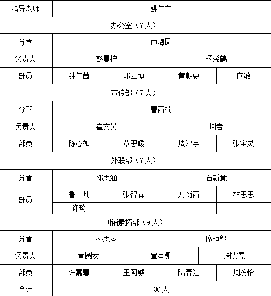 办公室:负责签到,会议记录;负责及时发布信息、通知;做好财务工作、并定期汇报;进行物品管理,资料保存,资料档案整理。