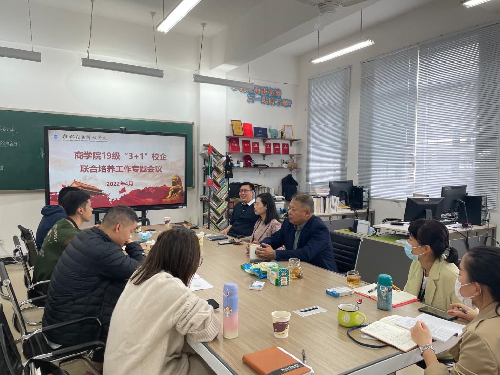 为进一步贯彻落实学校十四五发展规划的指导思想,深化校企融合,促进协同育人,提高人才培养质量,4月21日下午,商学院在11403室召开了商学院19级“3+1”校企联合培养工作专题会议。会议由商学院实践教研室主任沈洋主持,院长严宗光、党总支书记赵奕和各教研室主任、院办人员参会。