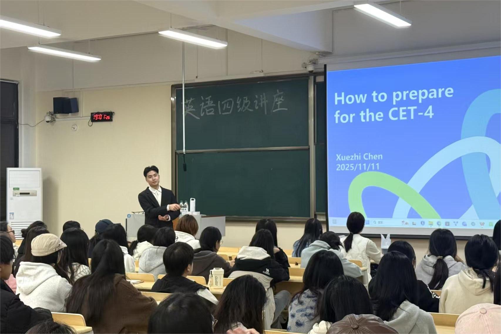 为提升学生英语四级考试备考成效,11月11日,商学院特邀专任教师陈学致在敏思楼D208教室举办专场备考讲座,近百名学生参与活动。