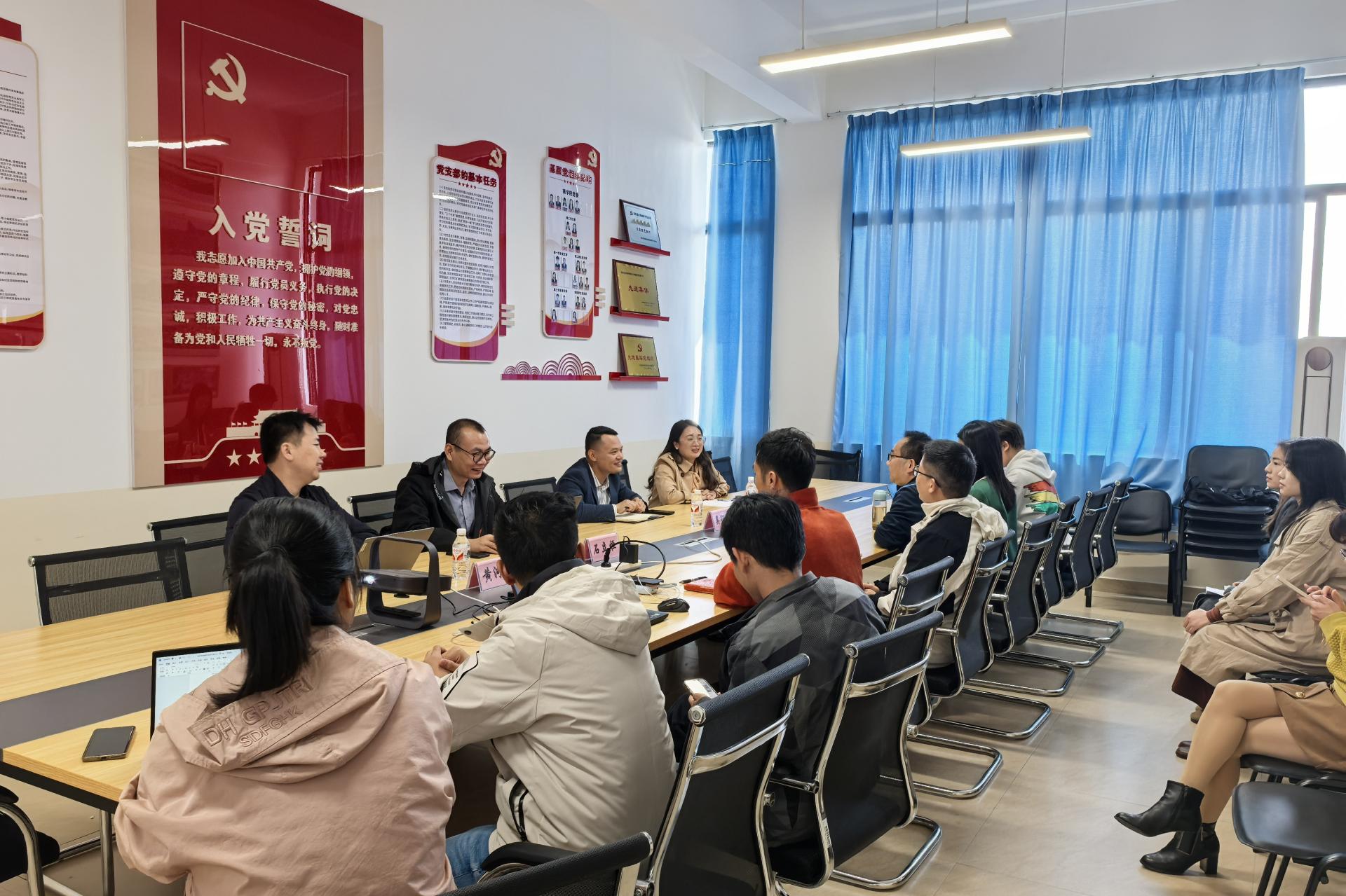 在会谈中,罗副院长强调了学院将从专业建设、教师发展、学生成长等多个维度,全面推进学科建设。金融科技教研室教研主任陈龙介绍了商学院金融科技教研室的基本情况,以及作为新筹办的金融科技专业正在积极完善师资队伍,做好将专业知识与实践相结合。新道公司的代表们分享了公司的历史历程以及他们在金融科技专业建设上的探索经验,如何将产业端的需求转化为教学内容。在讨论中,双方就金融科技专业的申报、学校后续建设定位、以及如何围绕金融+科技专业建设进行了深入交流。最后,双方就可能的项目合作、教材更新、企业大赛等多个方面进行了初步的沟通,并计划在未来进一步深化合作,共同推动beat365官网金融科技教育的发展。