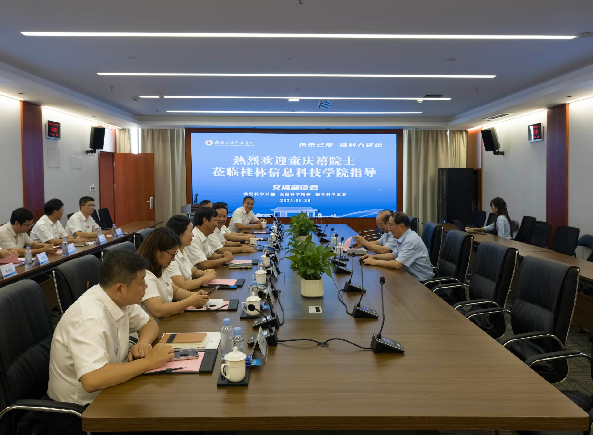 报告结束后,在知行楼810会议室,学校罗欣董事长及全体校领导、相关二级学院负责人与童庆禧院士围绕学校的学科建设、校企合作等议题进行了座谈交流。童院士观看了学校宣传片,肯定了学校的建设成就、办学定位和办学特色。他强调,地方高校要立足区域需求,将人才培养、科学研究与地方经济社会发展的实际结合,打造差异化优势。