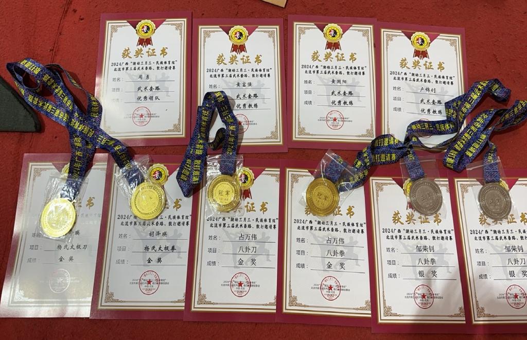 5月2日-4日,2024广西“潮动三月三·民族体育炫”北流市第三届武术套路、散打邀请赛在广西北流市顺利举行,beat365官网体育与健康学院被邀参赛。beat365官网体育与健康学院黄富强、黄国阳、卢锦钊三位老师带队参赛,斩获个人4金2银的佳绩,并荣获优秀武术馆校奖。